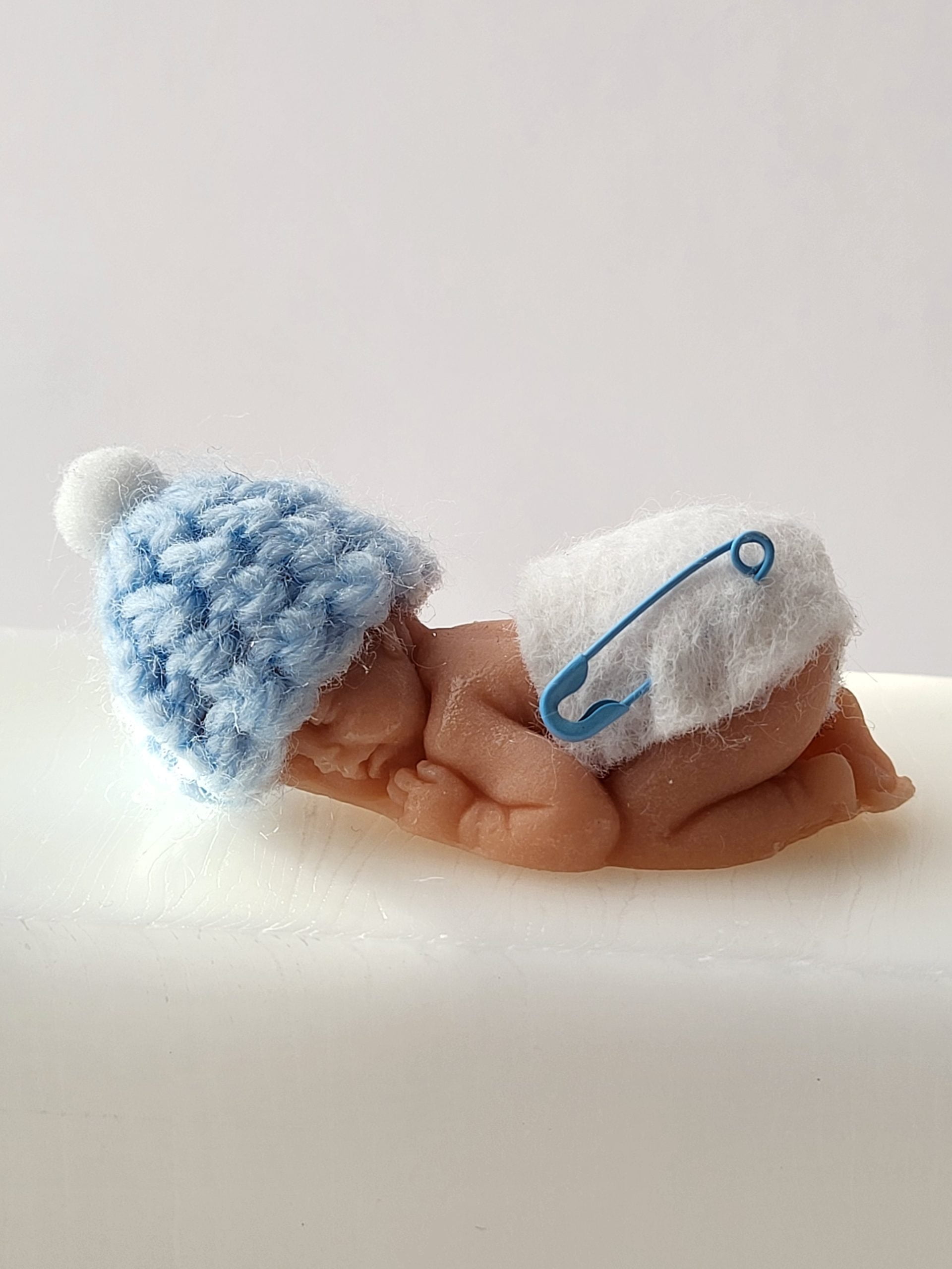 Handgjord tvål i form av en söt liten bebis. Bebisen har en virkad mössa i blå och en nål på blöjan, 5,5 cm lång. Fin att ge bort i present till en baby shower.