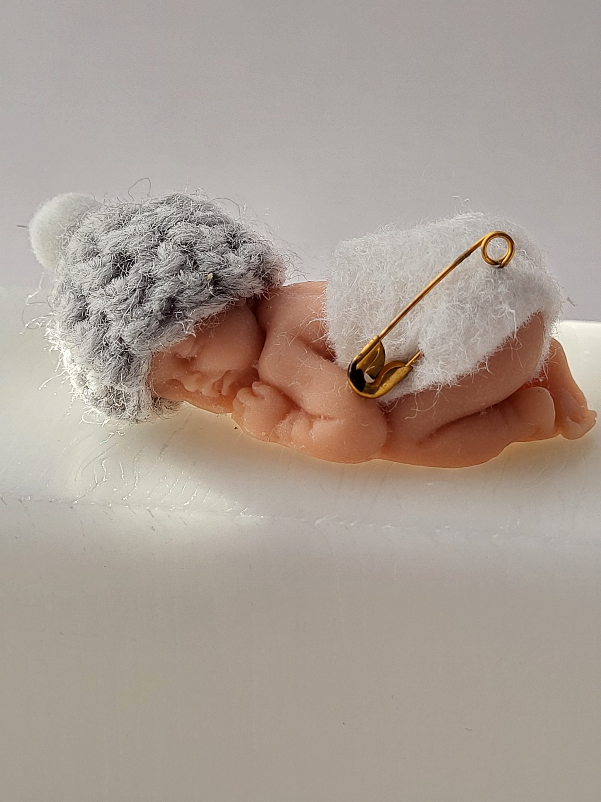 Handgjord tvål i form av en söt liten bebis. Bebisen har en virkad mössa i grå och en nål på blöjan, 5,5 cm lång. Fin att ge bort i present till en baby shower.