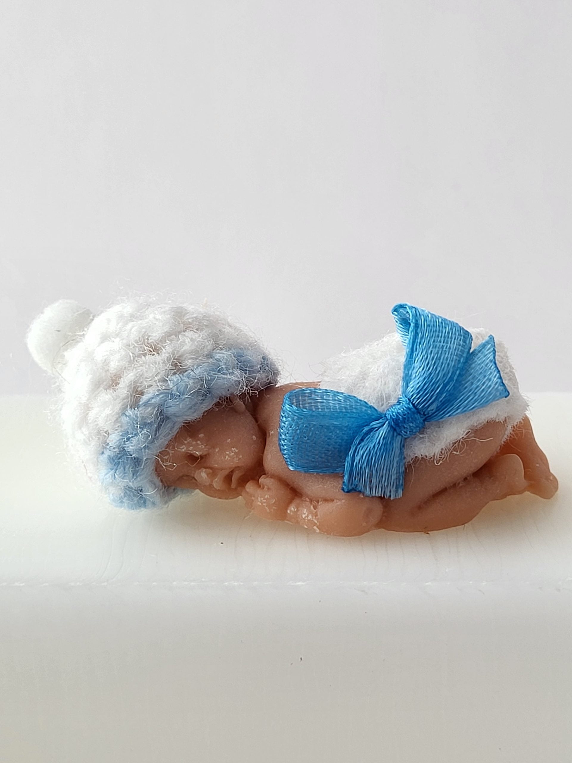 Handgjord tvål i form av en söt liten bebis. Bebisen har en virkad mössa i vitt/blå och en rosett på blöjan, 5,5 cm lång. Fin att ge bort i present till en baby shower.
