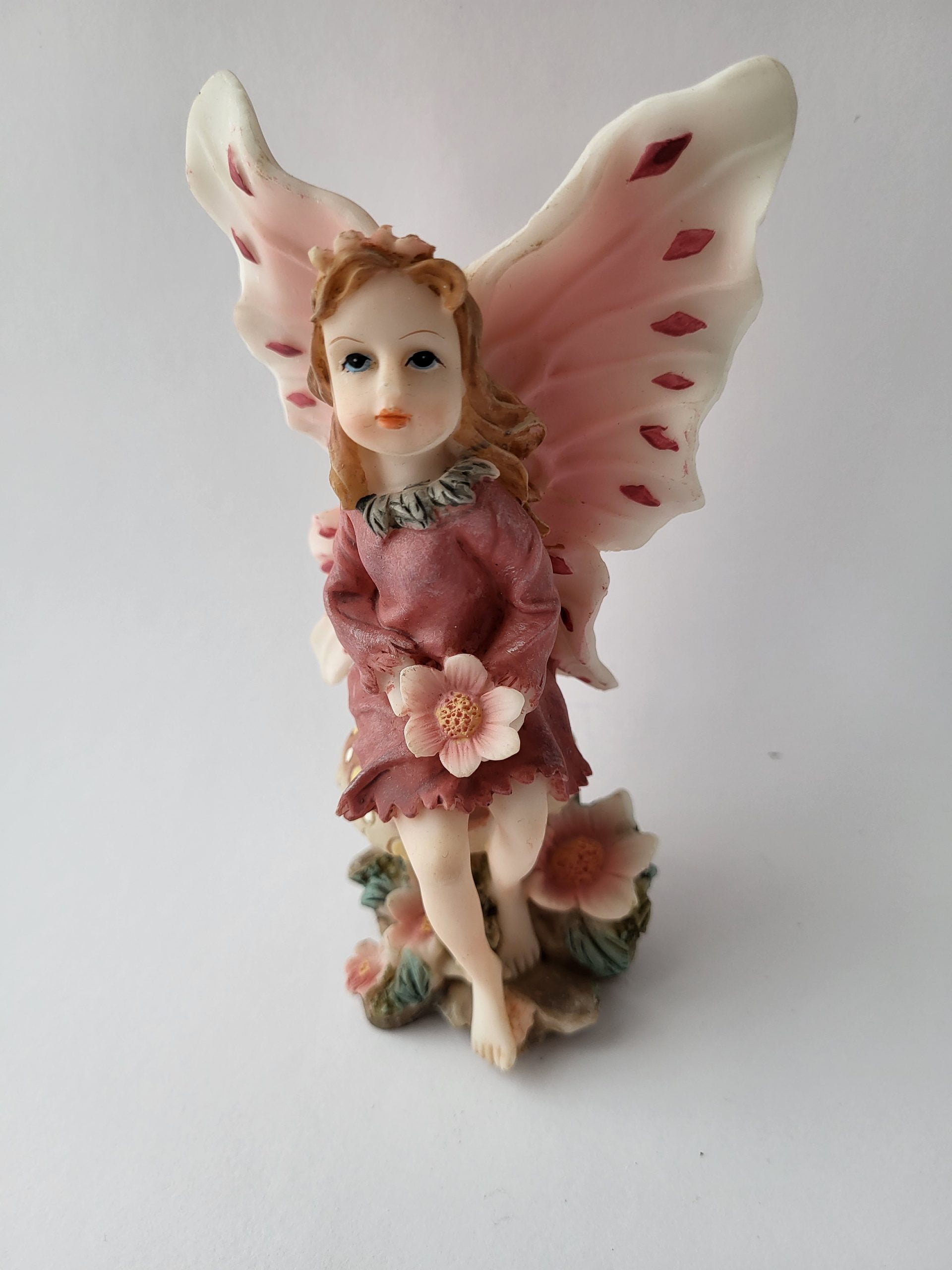 I sin vackra rosa klänning njuter blomsterälvan av den rosa blomman hon har plockat, polyresin, ca 11 cm