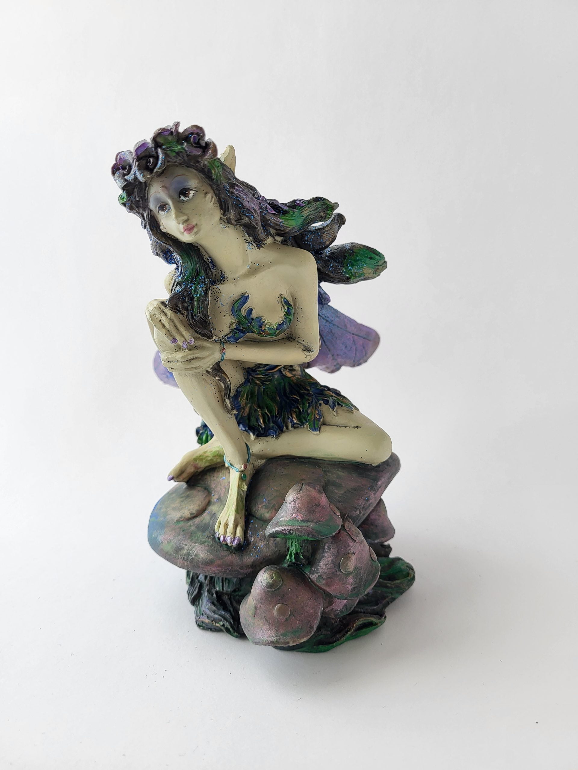 Gotisk änglafigur, med grönt hår och en krans av blommor, hon sitter på rosa svampar och har 1 ben upphöjt, 18 cm, polyresin