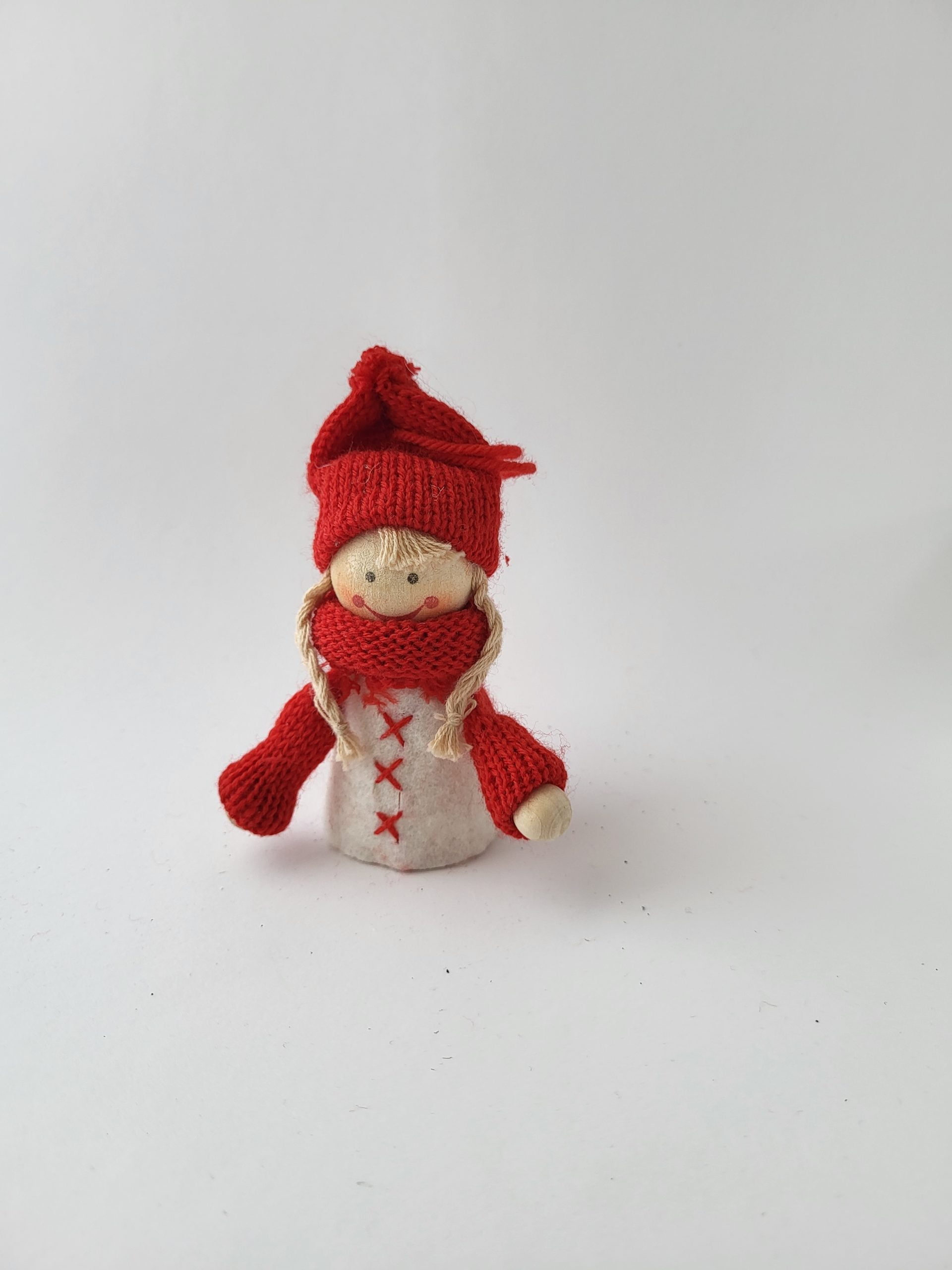 Tomte, tjej, vit/röd, 11 cm, med stickad mössa och slips